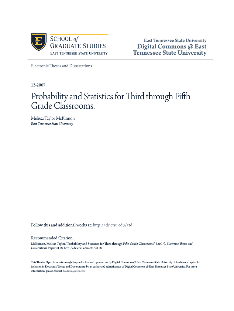 East Tennessee State UniversityDigital Commons East Tennessee State University Electronic Theses and Dissertations122007Probability and Statistics for Third through Fifth Grade Classrooms. Melissa