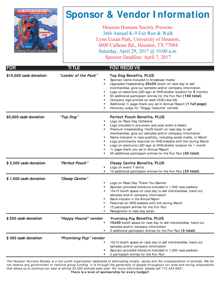 Sponsor & Vendor Information Houston Humane Society Presents: 36th Annual K9 Fun Run & Walk Lynn Susan Park, University of Houston, 4800 Calhoun Rd., Houston, TX 77004 Saturday, April 29, 2017 10:00