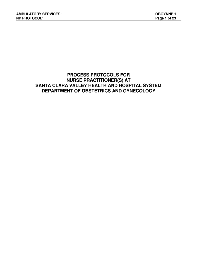 AMBULATORY SERVICES: NP PROTOCOL×OBEYING 1-Page 1 of 23PROCESS PROTOCOLS FOR NURSE PRACTITIONER(S) AT SANTA CLARA VALLEY HEALTH AND HOSPITAL SYSTEM DEPARTMENT OF OBSTETRICS AND GYNECOLOGYAMBULATORY