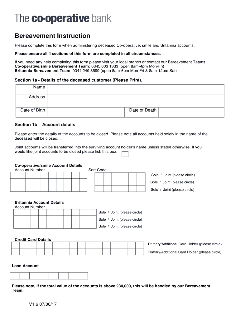 Bereavement Instruction Please complete this form when administering deceased Cooperative, smile and Britannia accounts. Please ensure all 4 sections of this form are completed in all circumstances.