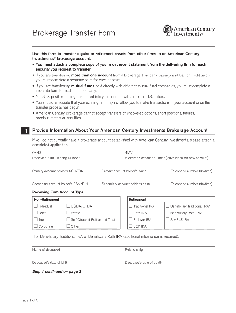 Brokerage Transfer Form Use this form to transfer regular or retirement assets from other firms to an American Century Investments brokerage account. You must attach a complete copy of your most recent