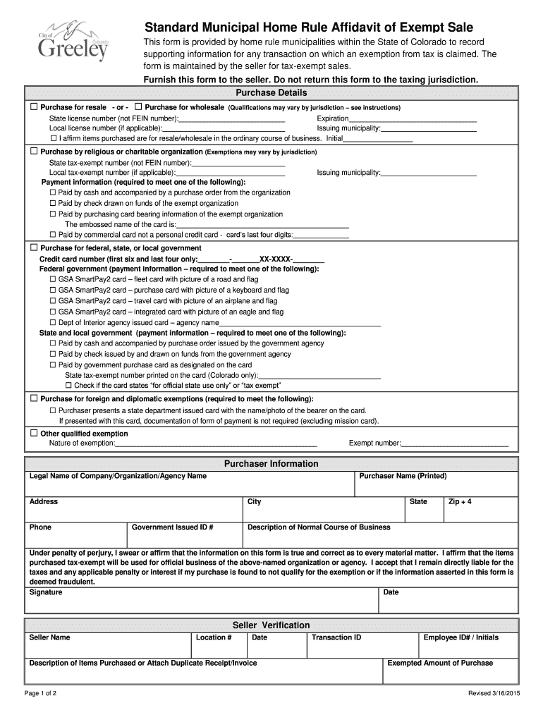 Standard Municipal Home Rule Affidavit of Exempt Sale This form is provided by home rule municipalities within the State of Colorado to record supporting information for any transaction on which an