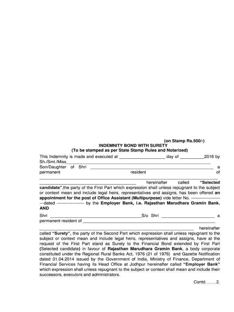 (on Stamp Rs.500/) INDEMNITY BOND WITH SURETY (To be stamped as per State Stamp Rules and Notarized) This Indemnity is made and executed at day of 2016 by Sh./SMT./Miss Son/Daughter of Sari a resident