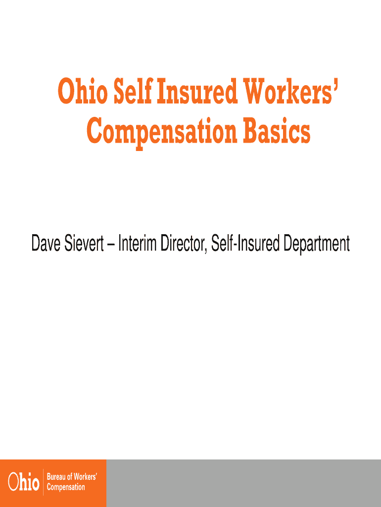 Ohio Self Insured Workers Compensation Basics Dave Sievert Interim Director, Reinsured DepartmentAgendao o definitions Claims Management Requirements Claim Reporting Claim File requirements Medical