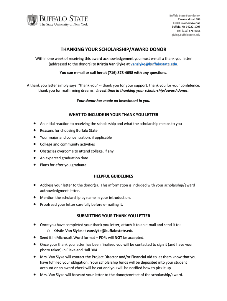 Buffalo State Foundation Cleveland Hall 304 1300 Elmwood Avenue Buffalo, NY 142221095 Tel: (716) 8784658 giving. Buffalo state. Thanking YOUR SCHOLARSHIP/AWARD DONOR Within one week of receiving this