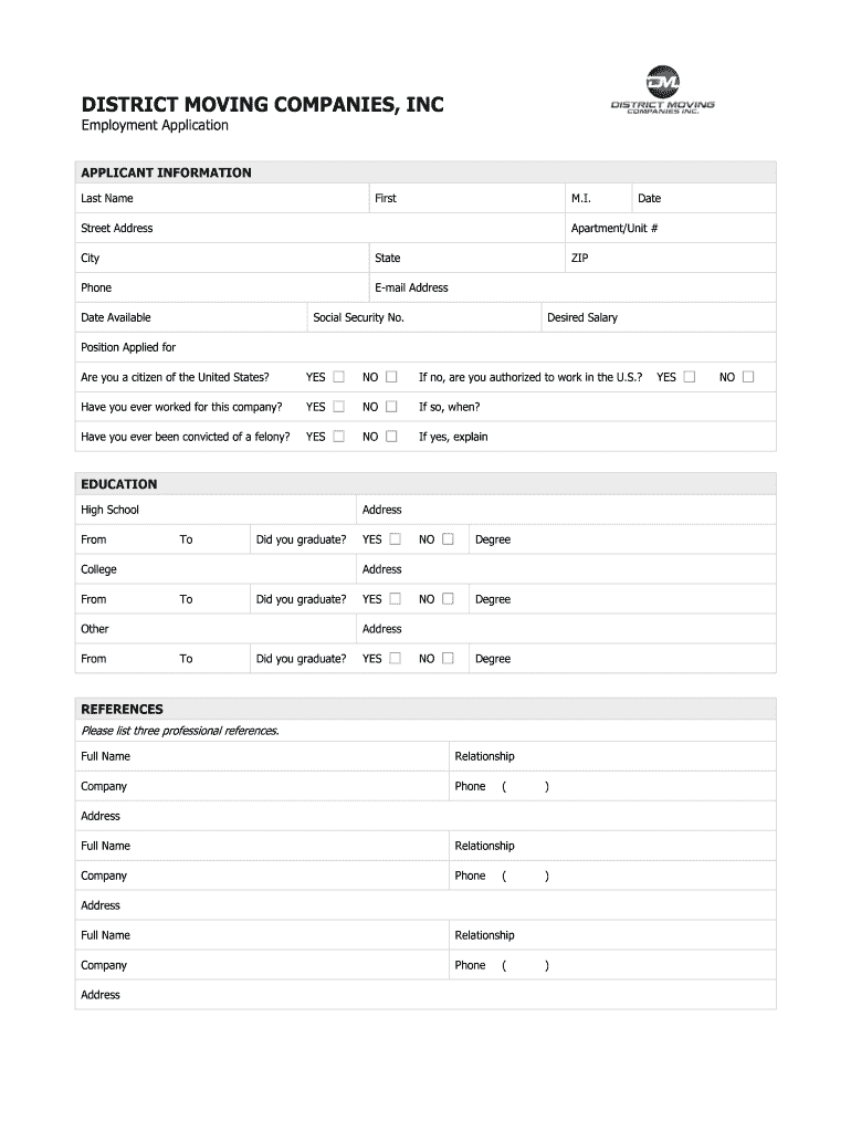DISTRICT MOVING COMPANIES, INC Employment Application APPLICANT INFORMATION Last Name First M.I. Street Address Date Apartment/Unit # City State Phone E-mail Address Date Available ZIP Social Security