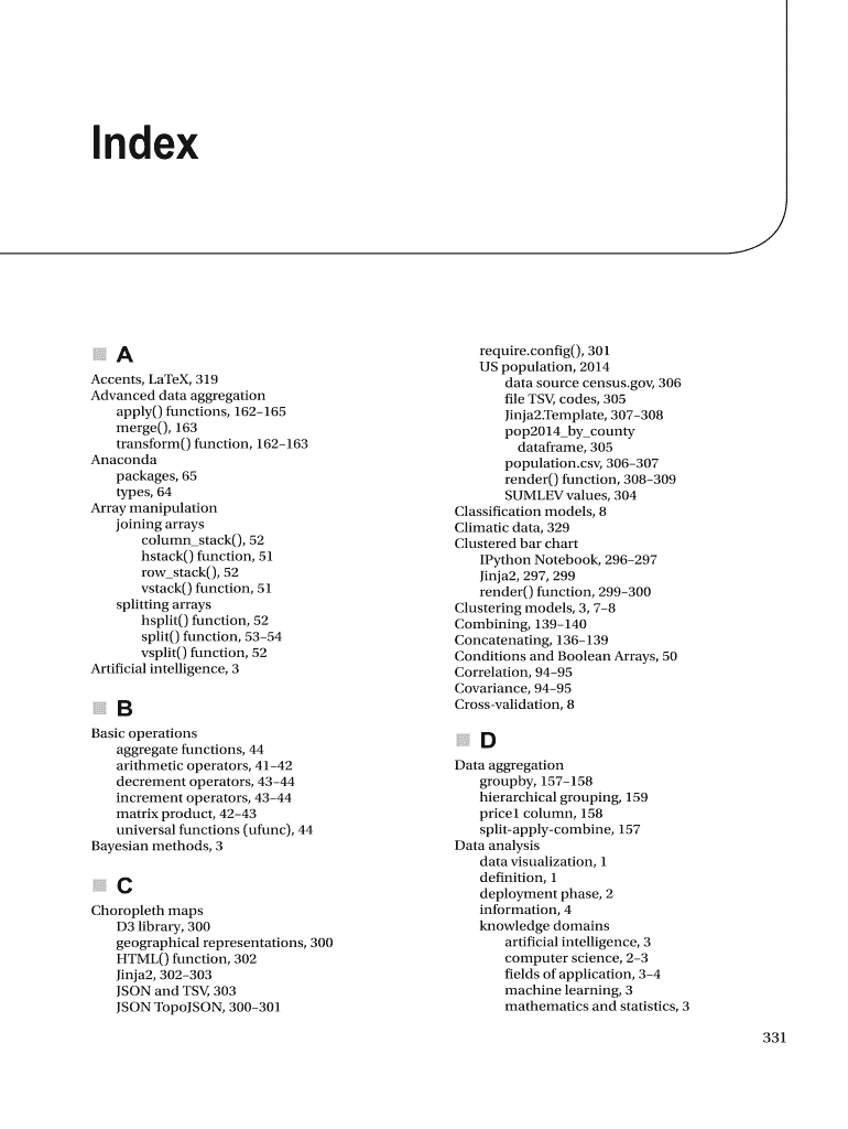 Index A Accents, LaTeX, 319 Advanced data aggregation apply() functions, 162165 merge(), 163 transform() function, 162163 Anaconda packages, 65 types, 64 Array manipulation joining arrays column stack(),