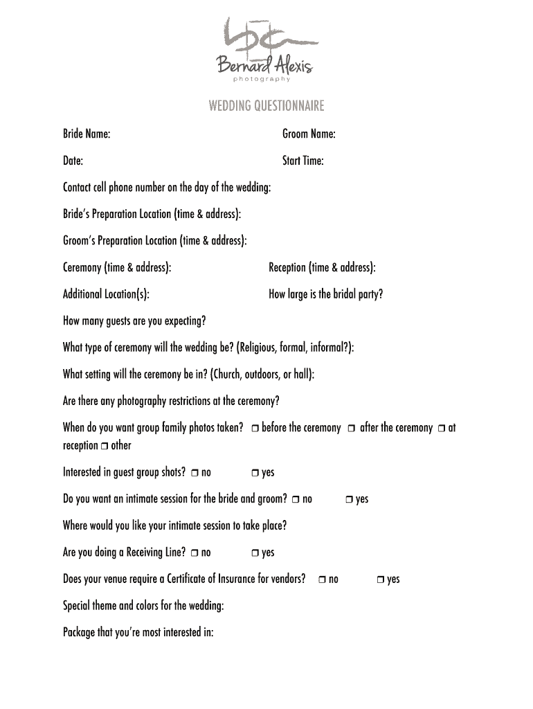 WEDDING QUESTIONNAIRE Bride Name:Groom Name:Date:Start Time:Contact cell phone number on the day of the wedding: Brides Preparation Location (time & address): Grooms Preparation Location (time & address):