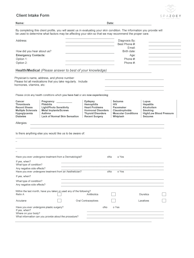 Name:Date:By completing this client profile, you will assist us in evaluating your skin condition. The information you provide will
