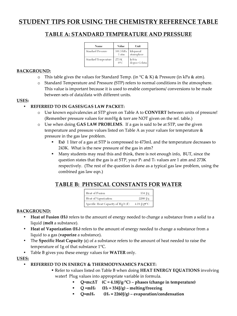 STUDENT TIPS FOR USING THE CHEMISTRY REFERENCE TABLE A: STANDARD TEMPERATURE AND PRESSURE BACKGROUND: o This table gives the values for Standard Temp. (in C & K) & Pressure (in PA & ATM). O Standard