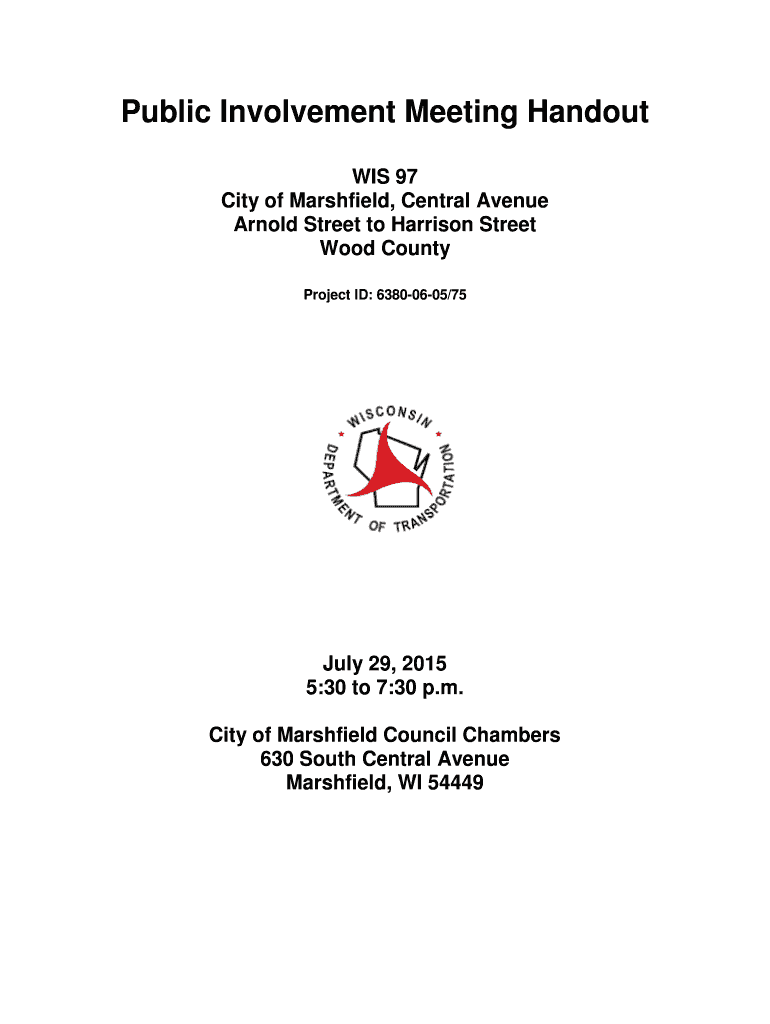 Public Involvement Meeting Handout WIS 97 City of Marsh field, Central Avenue Arnold Street to Harrison Street Wood County Project ID: 63800605/75July 29, 2015 5:30 to 7:30 p.m. City of Marsh field