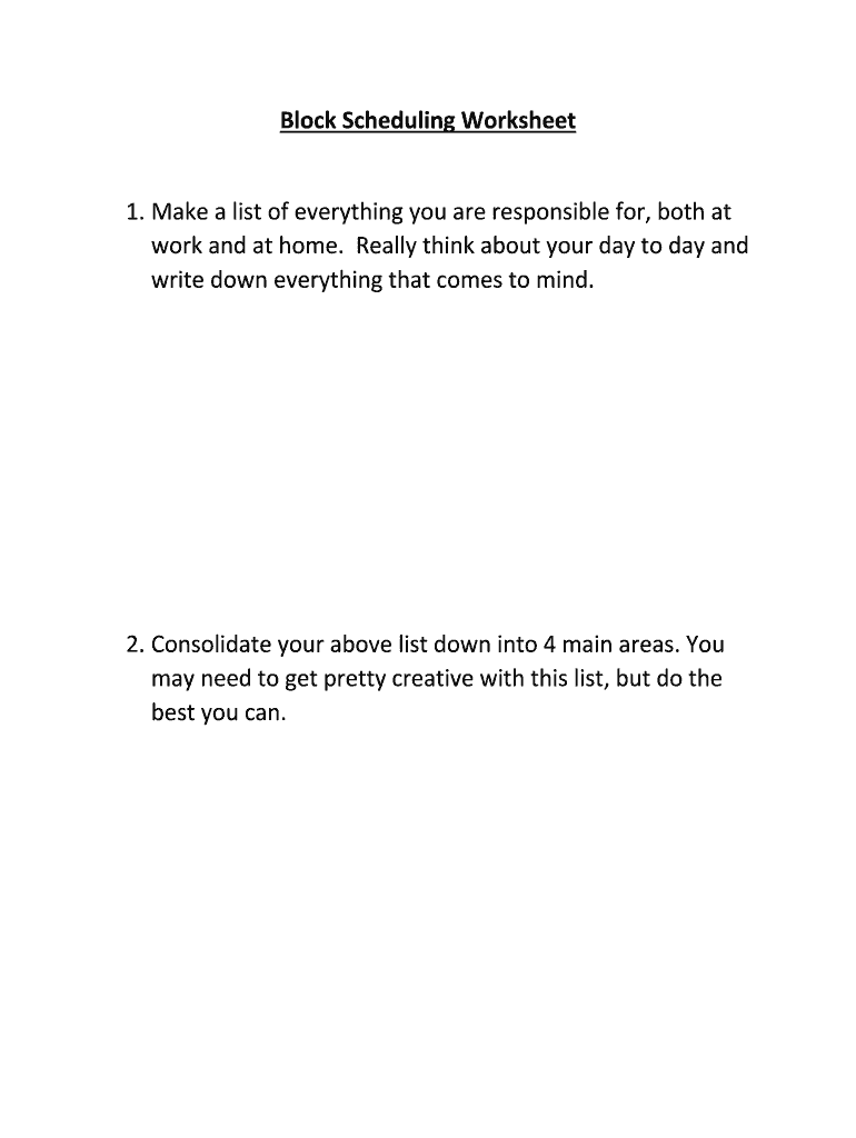 To fill out a block scheduling worksheet, you simply list the tasks or activities you need to complete and assign specific blocks of time to each.