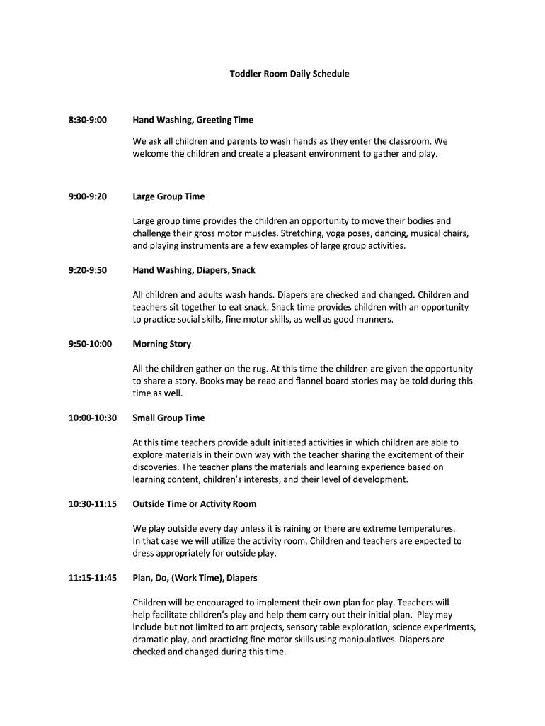 Toddler Room Daily Schedule8:309:00Hand Washing, Greeting Time