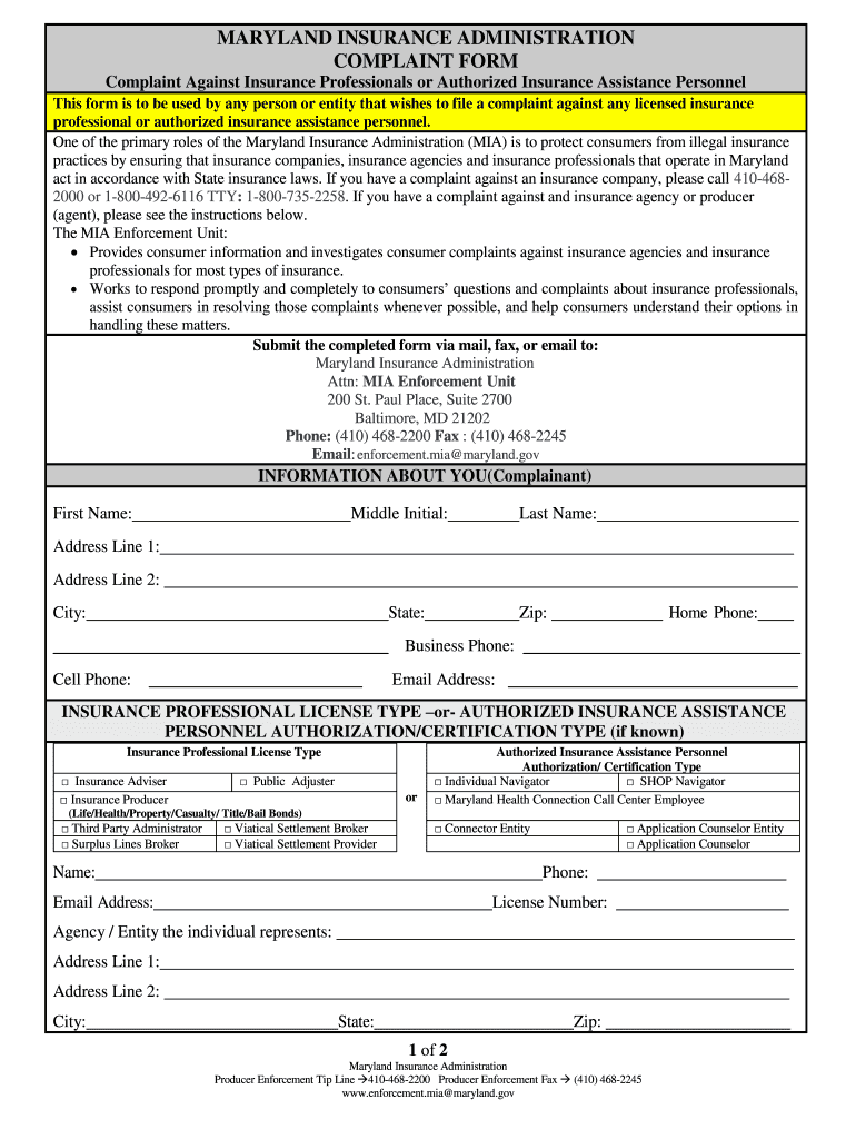Get the free Complaint Against Insurance Professionals or Authorized Insurance Assistance Personnel