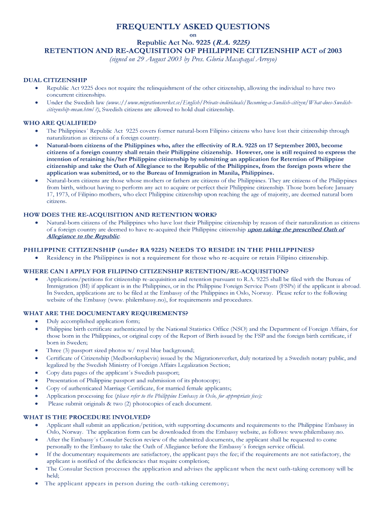 FREQUENTLY ASKED QUESTIONS republic Act No. 9225 (R.A. 9225) RETENTION AND ACQUISITION OF PHILIPPINE CITIZENSHIP ACT of 2003 (signed on 29 August 2003 by Pres. Gloria Macapá Arroyo) DUAL CITIZENSHIP