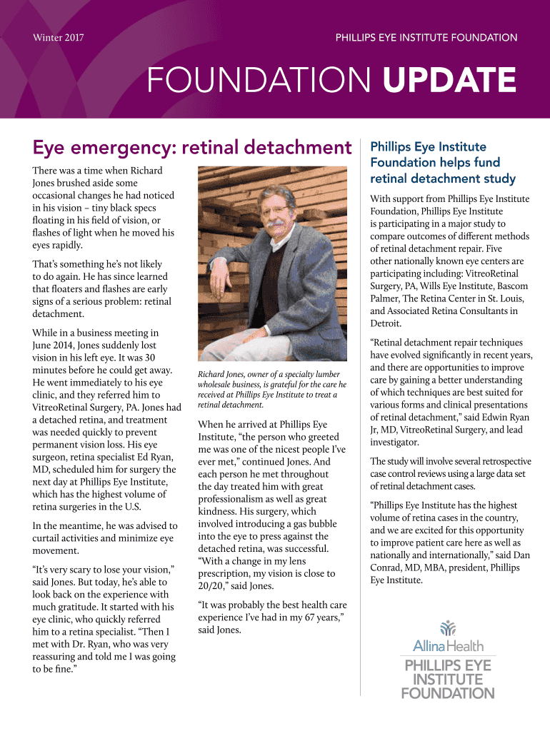 Winter 2017PHILLIPS EYE INSTITUTE FOUNDATIONFOUNDATION UPDATE Eye emergency: retinal detachment There was a time when Richard Jones brushed aside some occasional changes he had noticed in his vision