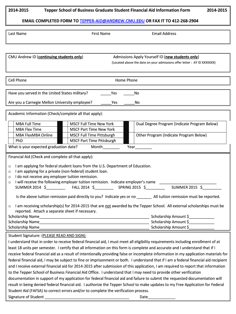 20142015Tepper School of Business Graduate Student Financial Aid Information Form20142015EMAIL COMPLETED FORM TO TEMPERATE ANDREW.CMU.EDU OR FAX IT TO 4122682904 Last NameFirst Name CMU Andrew ID