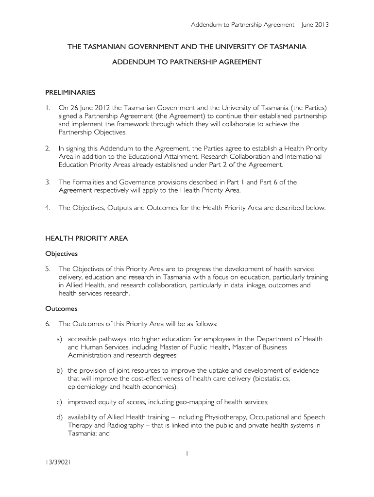 Addendum to Partnership Agreement June 2013THE TASMANIAN GOVERNMENT AND THE UNIVERSITY OF TASMANIA
