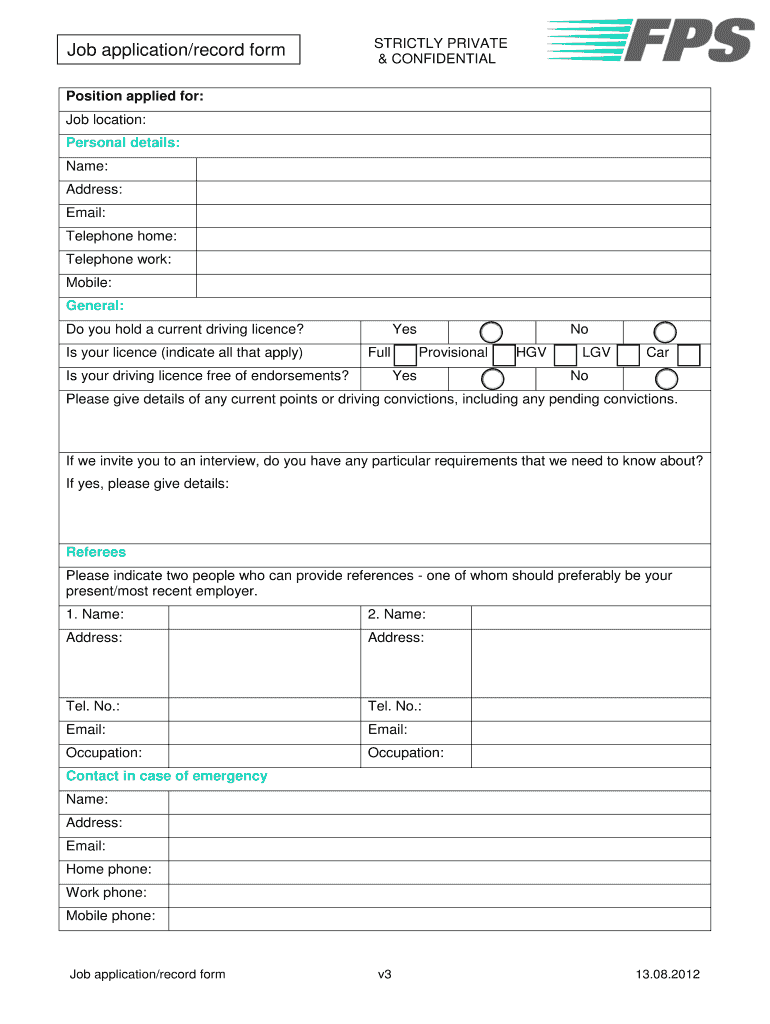 The Job Application Record Form is an employment application document used by applicants to provide personal details and relevant information for job applications.
