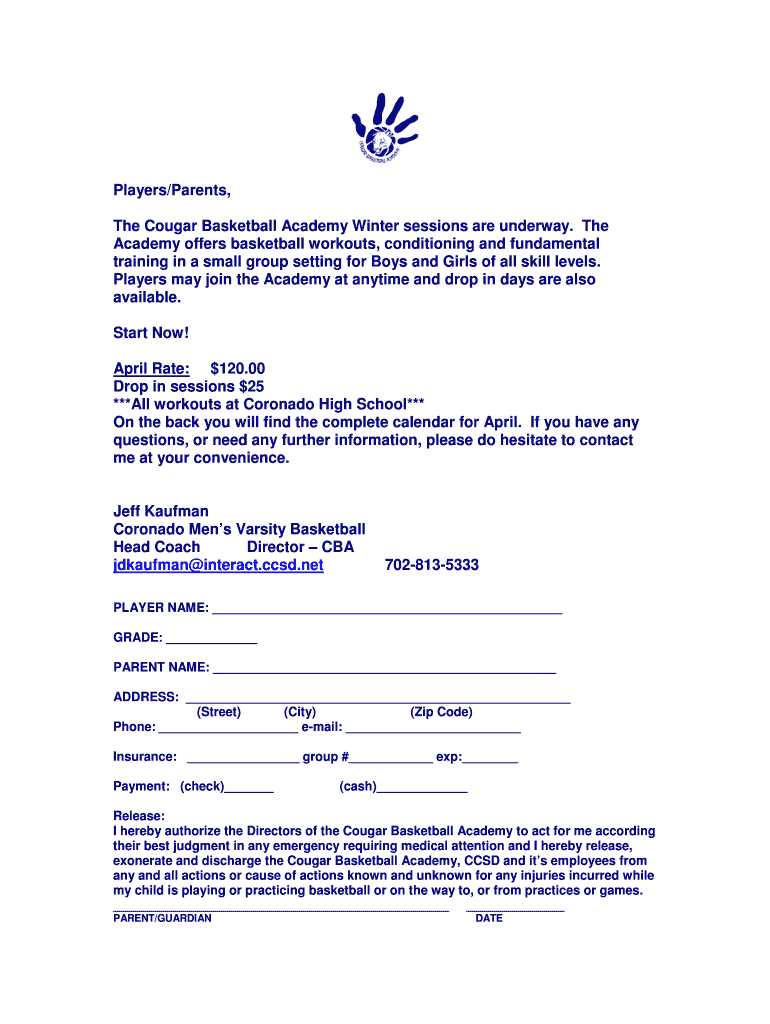 Include fields for each required information, such as parent's full name, relationship to the player, contact number, address, and email.