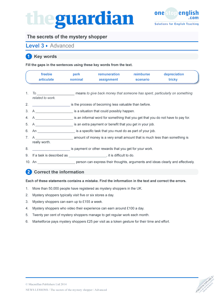 The secrets of the mystery shopperLevel 3Advanced1 Keywords Fill the gaps in the sentences using these keywords from the text.freebiearticulateperknominalremunerationassignmentreimbursescenariodepreciation