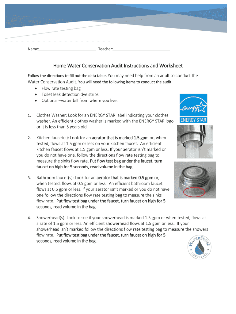 Name: Teacher: Home Water Conservation Audit Instructions and Worksheet Follow the directions to fill out the data table. You may need help from an adult to conduct the Water Conservation Audit. You