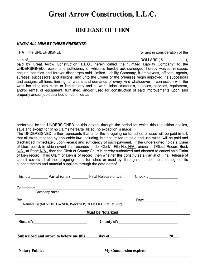 Great Arrow Construction, L.L.C. RELEASE OF LIEN KNOW ALL MEN BY THESE PRESENTS: THAT, the UNDERSIGNED for and in consideration of the sum of DOLLARS ($), paid by Great Arrow Construction, L.L.C.,