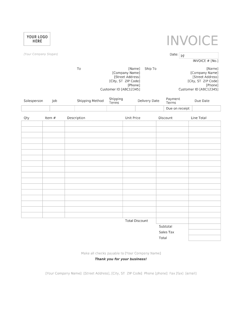 INVOICE Your Company Slogan Date:INVOICE # No. To Name Company Name Street Address City, ST ZIP Code Phone Customer ID ABC12345 Ship To Name Company Name Street Address City, ST ZIP Code Phone Customer