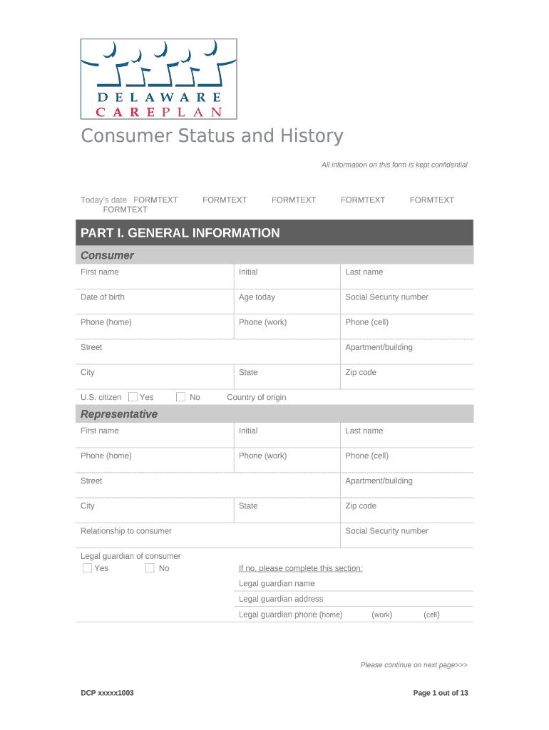 Today's date FORMER Part I. General informationConsumer First name Initial Last name Date of birth Age today Social Security number Phone (home) Phone (work) Phone (cell) Street Apartment/building