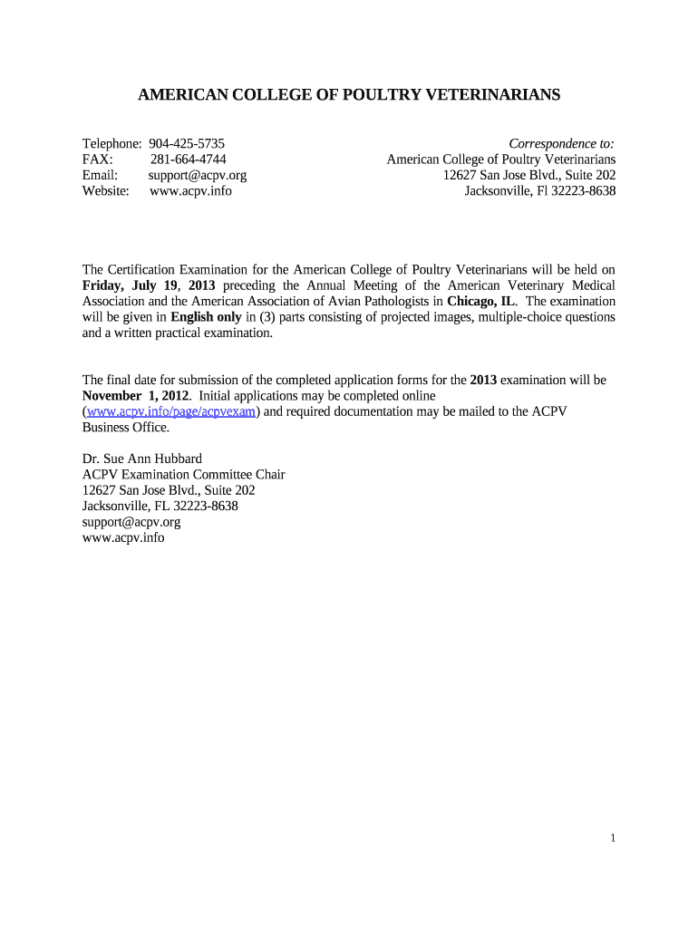 AMERICAN COLLEGE OF POULTRY VETERINARIANSTelephone: 9044255735×Correspondence to: