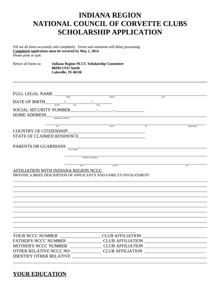 INDIANA REGION NATIONAL COUNCIL OF CORVETTE CLUBS SCHOLARSHIP APPLICATIONFill out all items accurately and completely. Errors and omissions will delay processing. Completed application must be received