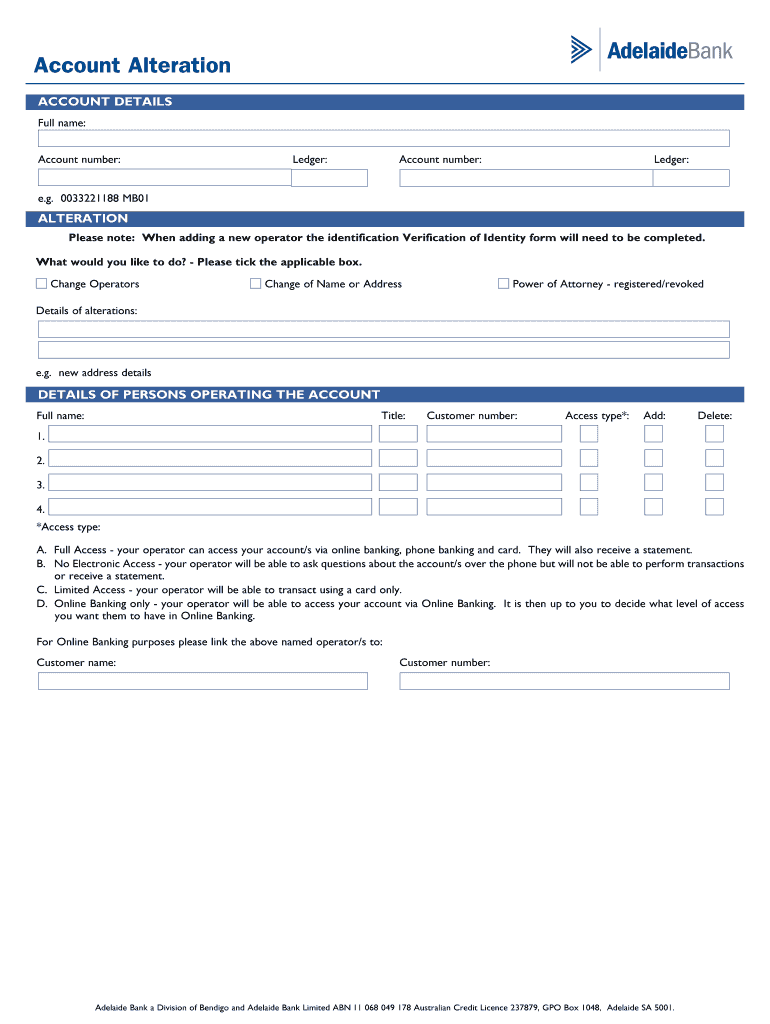 The Account Alteration Form is a financial document used by customers of Adelaide Bank to request changes to their account details.