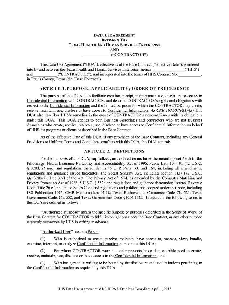 DATA USE AGREEMENT BETWEEN THE TEXAS HEALTH AND HUMAN SERVICES ENTERPRISE AND (CONTRACTOR) This Data Use Agreement (DUE), effective as of the Base Contract (Effective Date), is entered into by and