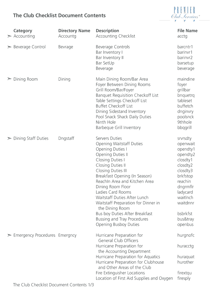 Get the free The Club Checklist Document Contents