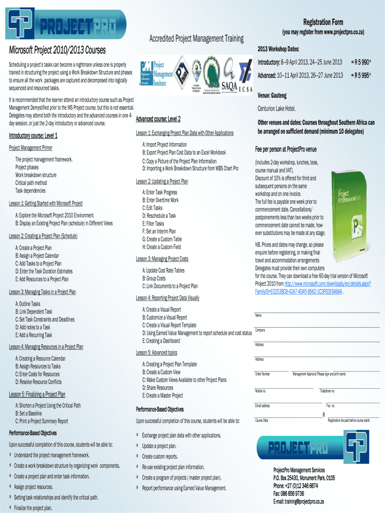 (you may register from www.projectpro.co.za)Accredited Project Management Training Microsoft Project 2010/2013 Courses2013 Workshop Dates:Scheduling a projects