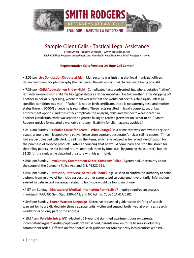 Sample Client Calls Tactical Legal Assistance From Smith Rodgers Website www.policehelp.net Each Call Was Received Immediately and Handled in Mealtime by a Smith Rodgers Attorney Representative Calls