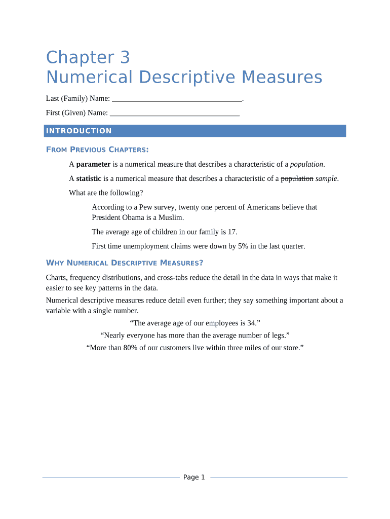 Chapter 3 Numerical Descriptive Measures Last (Family) Name:. First (Given) Name: Introduction From Previous Chapters: A parameter is a numerical measure that describes a characteristic of a population.