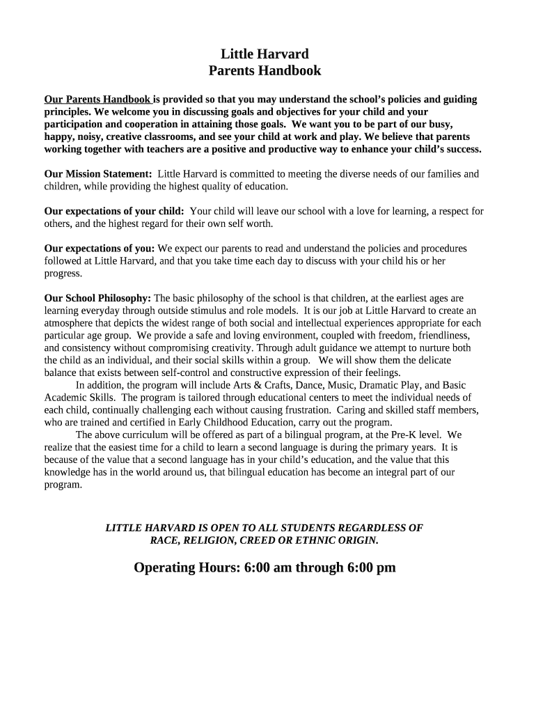 Parents Handbook is provided so that you may understand the schools policies and guiding principles. We welcome you in discussing goals and objectives for your child and your participation