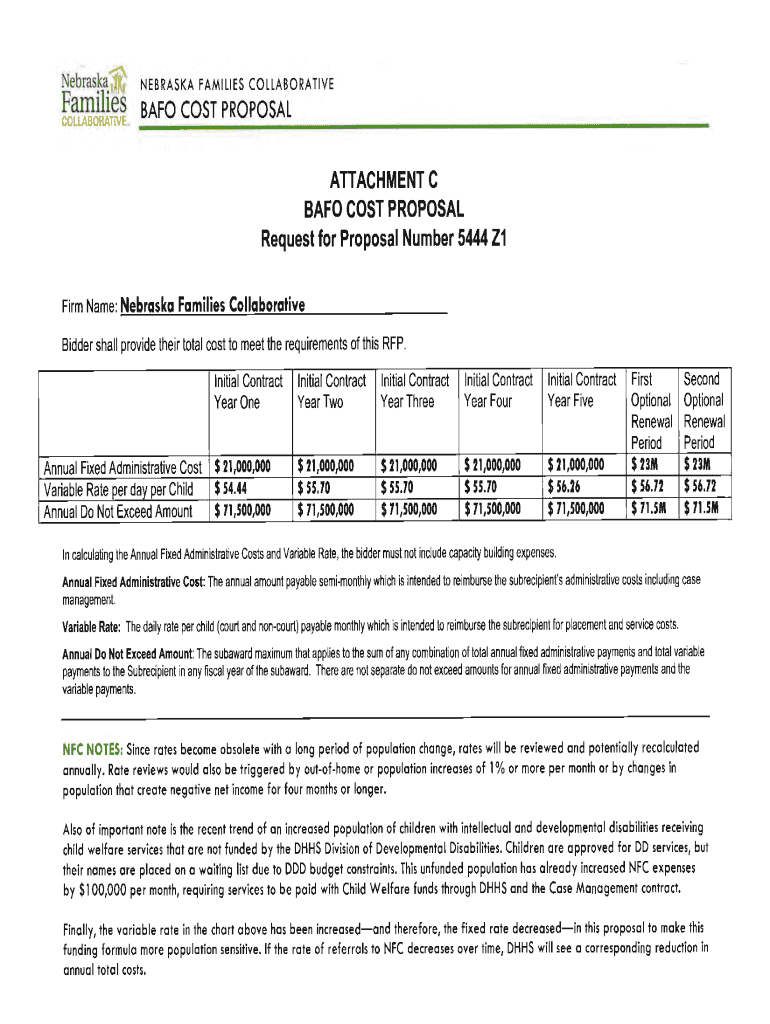 Zebra×a 'NEBRASKA FAMILIES COLLABORATIVECOLLABORATiVEwBAFO COST PROPOSALFamiliesATTACHMENT C BAFO COST PROPOSAL Request for Proposal Number 5444 21 Firm Names: Nebraska Families Collaborative Bidder