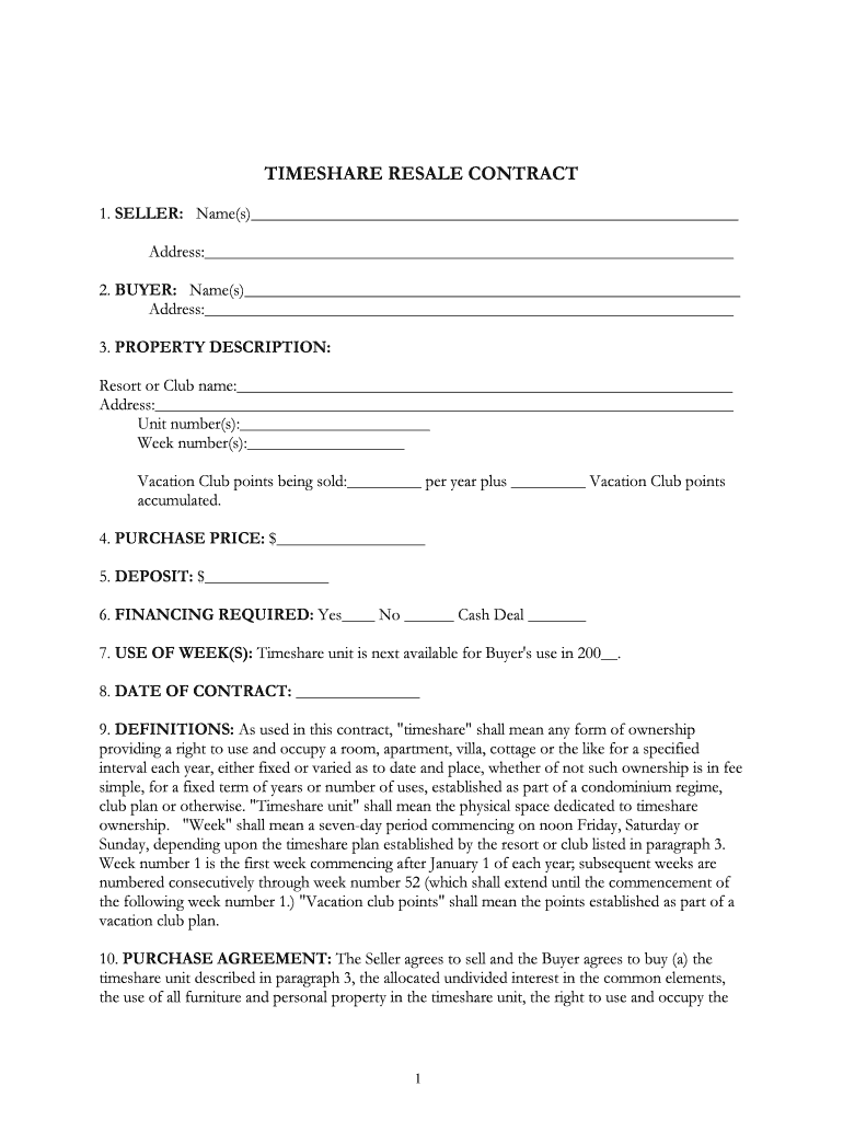 A comprehensive Timeshare Resale Contract includes several critical components: