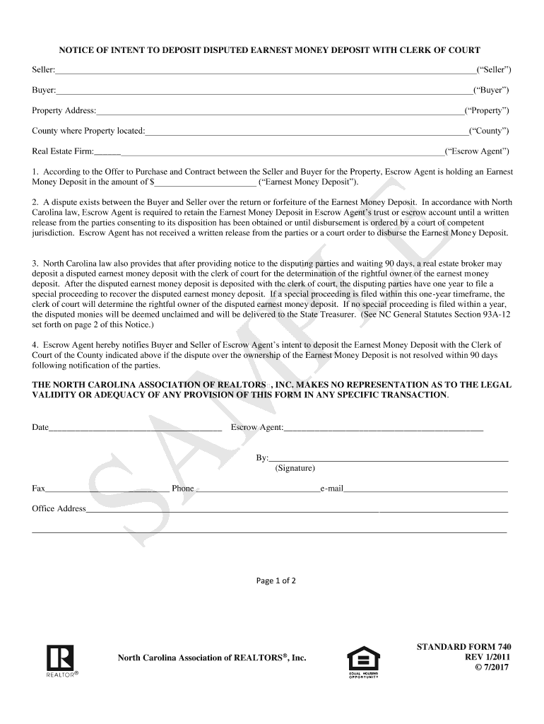 NOTICE OF INTENT TO DEPOSIT DISPUTED EARNEST MONEY DEPOSIT WITH CLERK OF COURT Seller: (Seller) Buyer: (Buyer) Property Address: (Property) County where Property located: (County) Real Estate Firm: