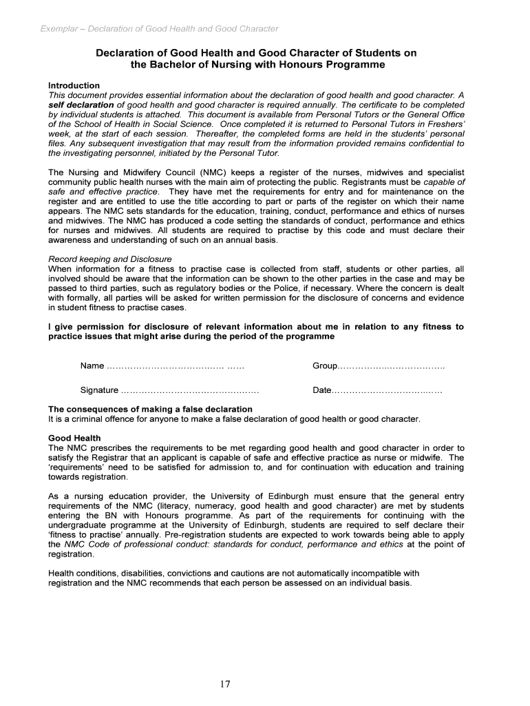 Exemplar Declaration of Good Health and Good CharacterDeclaration of Good Health and Good Character of Students on the Bachelor of Nursing with Honors Program Introduction This document provides essential