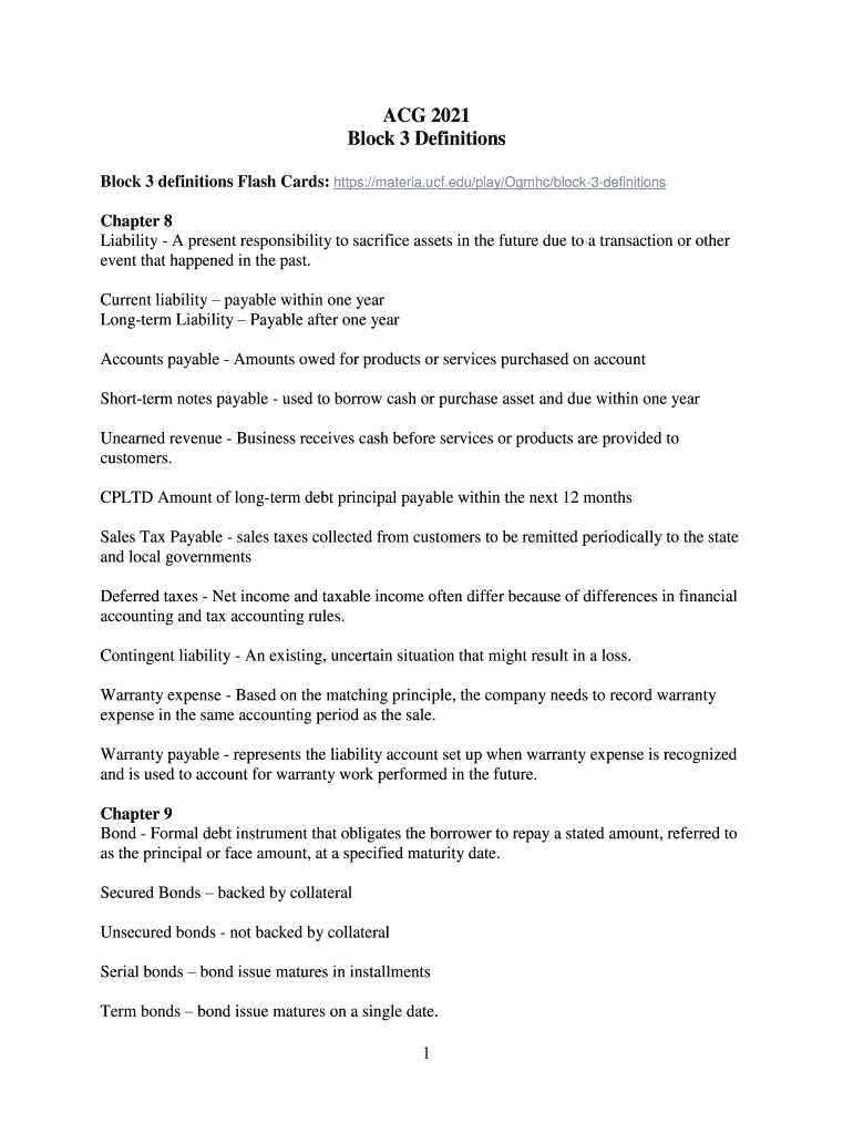 ACG 2021 Block 3 Definitions Block 3 definitions Flash Cards: https://materia.ucf.edu/play/Ogmhc/block3definitions Chapter 8 Liability A present responsibility to sacrifice assets in the future due