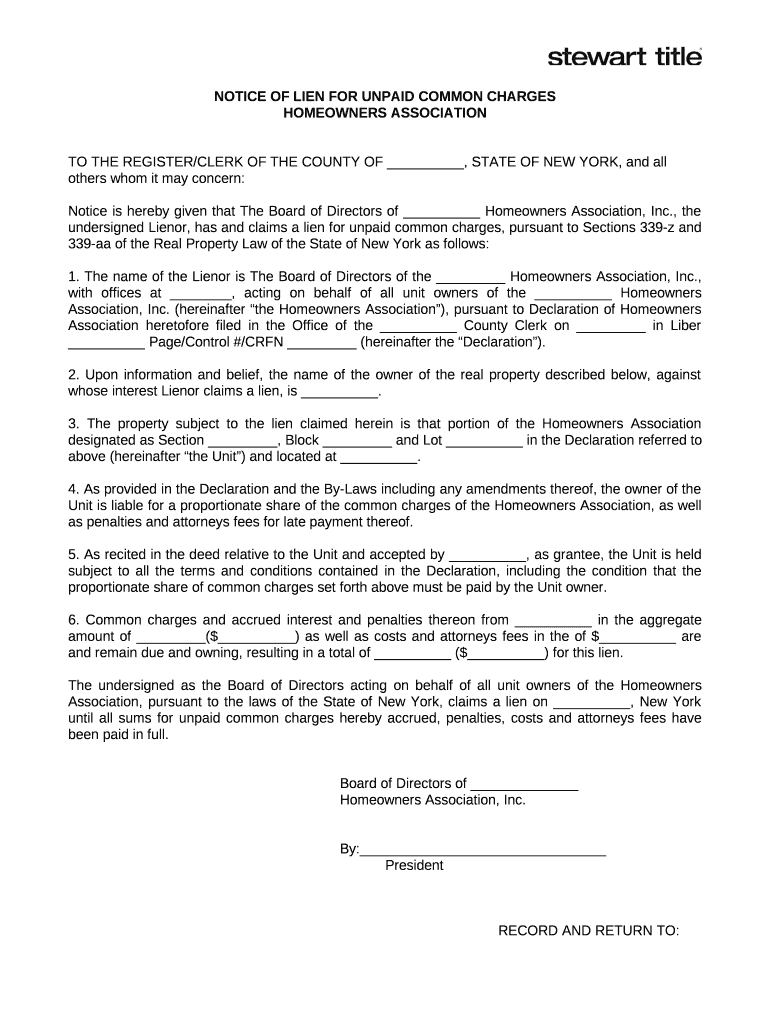 NOTICE OF LIEN FOR UNPAID COMMON CHARGES HOMEOWNERS ASSOCIATION TO THE REGISTER/CLERK OF THE COUNTY OF, STATE OF NEW YORK, and all others whom it may concern:Notice is hereby given that The Board