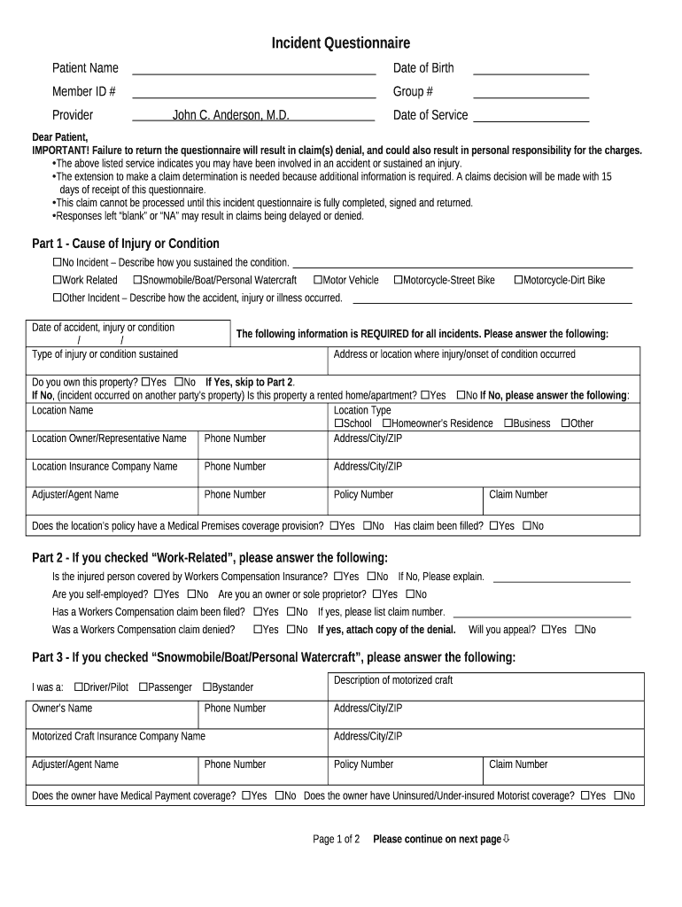 Incident QuestionnairePatient Name Date of Birth Member ID # Group # Provider John C. Anderson, M.D. Date of Service Dear Patient, IMPORTANT! Failure to return the questionnaire will result in claim(s)
