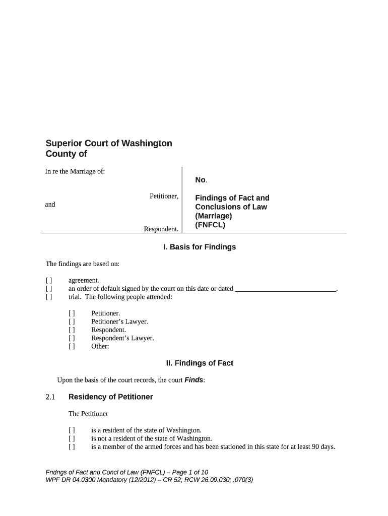 Superior Court of Washington County Odin re the Marriage of:Petitioner, correspondent. No. Findings of Fact and Conclusions of Law(Marriage) (FN FCL)I. Basis for Findings are based on: agreement.