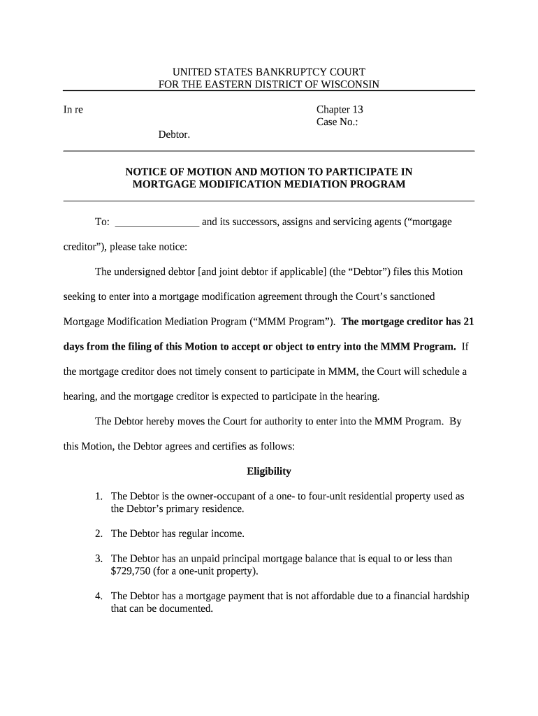 UNITED STATES BANKRUPTCY COURT FOR THE EASTERN DISTRICT OF Wisconsin recharter 13Case No.:Debtor.NOTICE OF MOTION AND MOTION TO PARTICIPATE MORTGAGE MODIFICATION MEDIATION Program: and its successors,