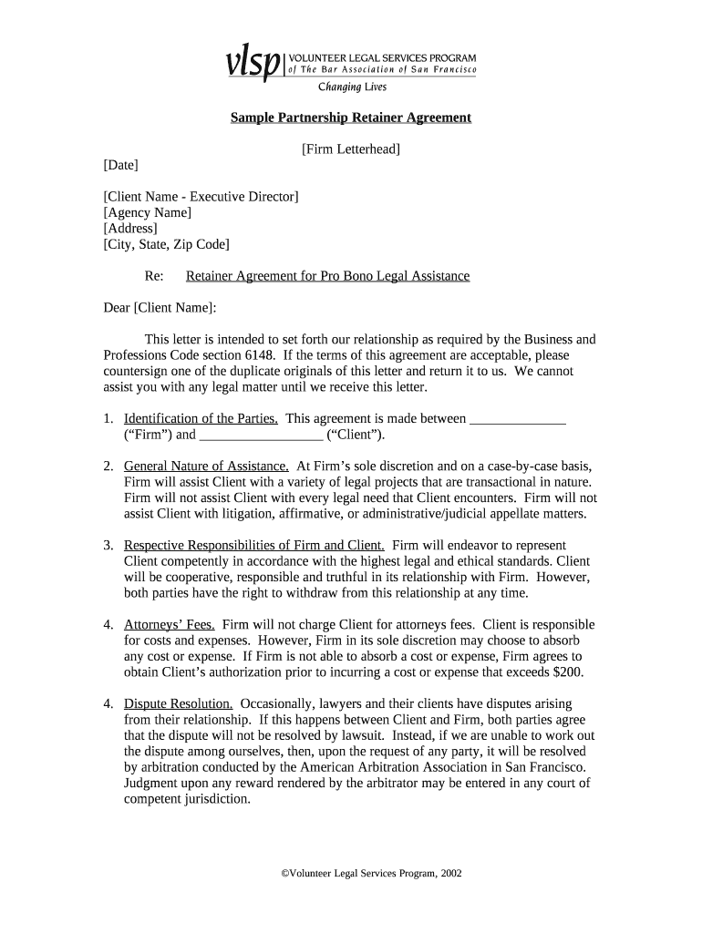 Sample Partnership Retainer Agreement Firm Letterhead Date Client Name Executive Director Agency Name Address City, State, Zip Code Re: Retainer Agreement for Pro Bono Legal AssistanceDear Client