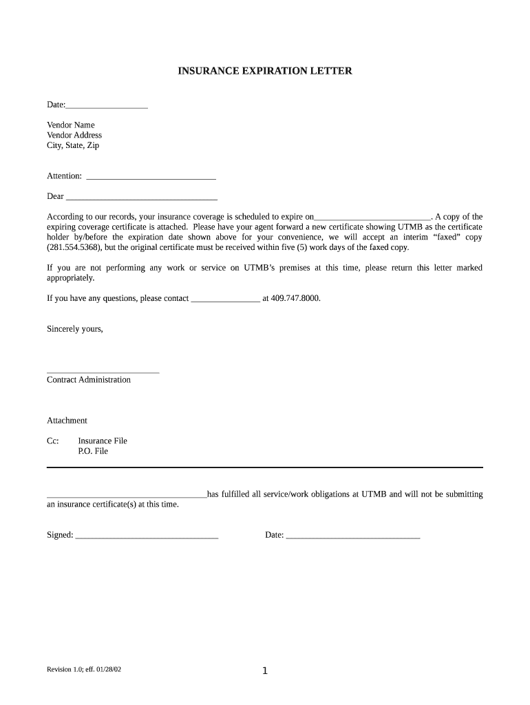 INSURANCE EXPIRATION Littermate: Vendor Name Vendor Address City, State, Inattention: Dear According to our records, your insurance coverage is scheduled to expire on. A copy of the expiring coverage