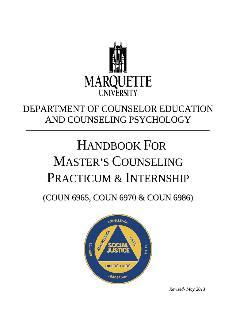 DEPARTMENT OF COUNSELOR EDUCATION AND COUNSELING PSYCHOLOGYHANDBOOK FORMATTERS COUNSELINGPRACTICUM & INTERNSHIP(COIN 6965, COIN 6970 & COIN 6986)Revised May 2013TABLE OF CONTENTSOverview of the Marquette